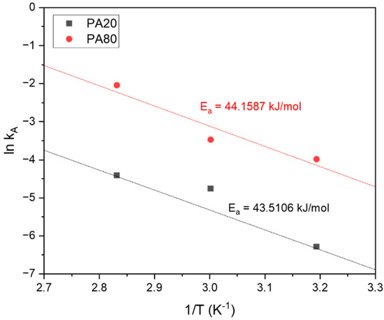 Based on the results obtained for the Avrami model, the mean value of the coefficient was 0.81347 for PA20 and 0.62143 for PA80. The activation energy () for each sample subjected to the leaching process with heating was determined using the linearized Arrhenius law, as shown in Equation (19). This determination was performed by interpolating the data obtained through Avrami kinetics, and the results are presented in Figure 5.