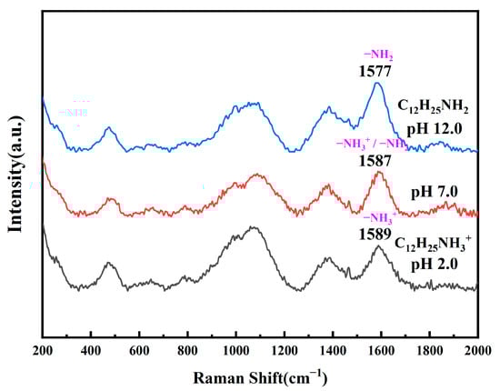 Figure 1 shows the effect of pH on the Raman spectra of a 2% solution of dodecylamine. Spectral lines in the 400–600 cm−1 region represent the vibrational peaks of dodecylamine carbon skeleton deformation; peaks in the 800–1200 cm−1 region are the rocking vibration peaks of dodecylamine CH2 and CH3, as well as the stretching vibration peaks of CH2-CH2 and CH2-CH3; peaks in the 1300–1450 cm−1 region consist of the CH2 shear vibration peak and the CH3 asymmetric deformation vibration peak of dodecylamine; and the shear peaks near 1600 cm−1 represent NH2 or NH3+ [28]. Among them, the 1589 cm−1 peak corresponds to the NH3+ shear vibration peak, the 1587 cm−1 peak corresponds to the NH3+ and NH2 shear vibration peaks, and the 1577 cm−1 peak corresponds to the NH2 shear vibration peak. The peak in the range of 400–1450 cm−1 did not show a significant shift when the pH of the solution decreased from 12.0 to 2.0, but the NH2 group gradually protonated to form NH3+, causing the 1577 cm−1 shear vibration peak to shift towards the higher wave number (1589 cm−1 peak). The Raman spectroscopy detection results in Figure 1 indicate that under acidic conditions, dodecylamine in the solution is mainly in the ionic state of NH3+. Under alkaline conditions, the dodecylamine in solution is mostly in the molecular state NH2.