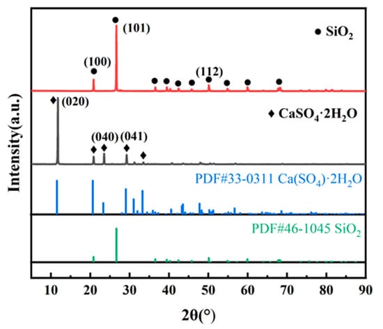 Phosphogypsum is a large waste byproduct of the phosphochemical industry. For every ton of phosphoric acid produced, about 5 tons of phosphogypsum are produced [1]. The global inventory of phosphogypsum has exceeded 6 billion tons [2,3], and the cumulative storage of phosphogypsum in China has exceeded 830 million tons, with an annual utilization rate of about 45% [4]. Long term storage not only occupies land, but also easily causes comprehensive pollution of water, soil, and air [5]. The main component of phosphogypsum is calcium sulfate dihydrate (CaSO4·2H2O, 80%–90%), and the main impurity is silicon dioxide (SiO2, 4%–20%) [4]. The industrial application of phosphogypsum is greatly restricted by coexisting impurities [6,7,8,9,10,11,12,13]. Selective separation of calcium sulfate dihydrate and silicon dioxide is the key to impurity removal.