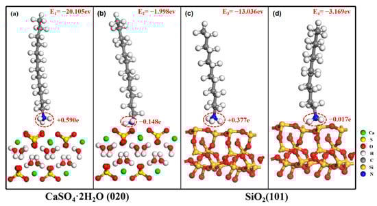 Figure 3a–d show the stable adsorption configuration of CaSO4·2H2O (020) to C12H25NH3+, CaSO4·2H2O (020) to C12H25NH2, SiO2 (101) to C12H25NH3+, and SiO2 (101) to C12H25NH2, respectively. Calculation results show that the adsorption energies are E1 = −20.105 eV, E2 = −1.998 eV, E3 = −13.036 eV, and E4 = −3.169 eV, respectively. The isoelectric point of calcium sulfate dihydrate and silicon dioxide is approximately pH = 2.0 [29,30,31]. When pH > 2.0, both calcium sulfate dihydrate (020) and silicon dioxide (101) crystal surfaces are negatively charged. The amino group head of the dodecylamine ion (C12H25NH3+) is an electron deficient group with a positive charge, while the amino group head of the dodecylamine molecule (C12H25NH2) is an electron rich group with a negative charge. Dodecylamine adsorbs onto the crystal faces of calcium sulfate dihydrate (020) and silicon dioxide (101) through the amino group head.