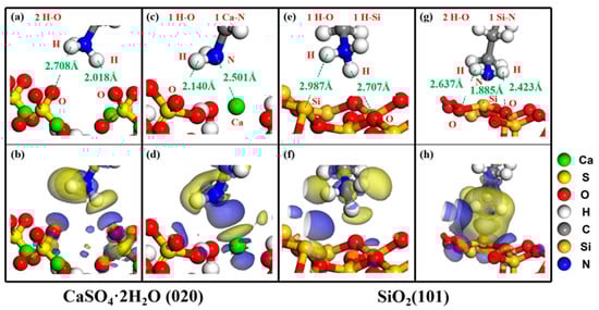 Figure 4a,b show that there is a significant electronic interaction between two H-O atoms at the CaSO4·2H2O (020)-C12H25NH3+ adsorption interface, with distances of 2.018 Å and 2.708 Å, respectively. The length of the H-O bond in the O-H…O hydrogen bond is approximately 1.200–1.215 Å [32], and the length of the H-O bond in the N-H…O hydrogen bond is approximately 1.95 Å [33], indicating electrostatic interaction between H-O atoms. Figure 4c,d show that there is a significant electronic interaction between one Ca-N atom and one H-O atom at the CaSO4·2H2O (020)-C12H25NH2 adsorption interface. The distances between Ca-N atoms and H-O atoms are 2.140 Å and 2.501 Å, respectively. The bond length of Ca-N is approximately 2.31–2.51 Å [34], indicating the formation of coordination bonds between Ca-N atoms. Figure 4e,f show that there is a significant electronic interaction between one H-O atom and one H-Si atom at the SiO2(101)-C12H25NH3+ adsorption interface. The distances between H-O atoms and H-Si atoms are 2.707 Å and 2.987 Å, respectively, both of which are electrostatic interactions. Figure 4g,h show that there is a significant electronic interaction between one Si-N atom and two H-O atoms at the SiO2 (101)-C12H25NH2 adsorption interface. The distances between Si-N atoms and H-O atoms are 1.885 Å, 2.423 Å, and 2.637 Å, respectively. The Si-N bond length is approximately 1.70–1.78 Å [35], indicating that there is electrostatic interaction between Si-N atoms.