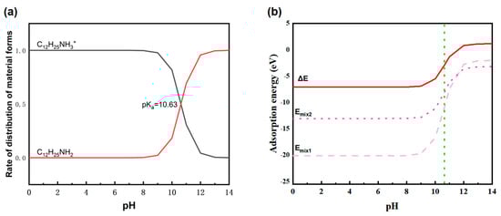 The distribution coefficient of ion/molecular state dodecylamine varies with pH as shown in Figure 5a. When pH < 10.63, dodecylamine mainly exists in an ionic state. When pH > 10.63, dodecylamine mainly exists in molecular form. At pH 10.63, the distribution coefficients of dodecylamine in both molecular and ionic states are equal, both being 0.5.