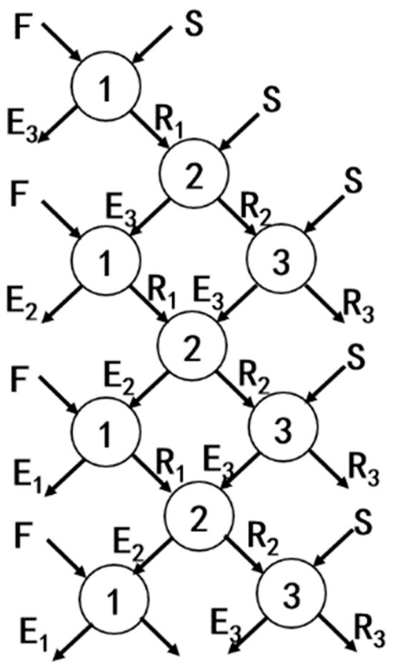 The schematic diagram of the countercurrent extraction process is illustrated in Figure 1. In this process, the feed solution (F) and the organic phase (S) were mixed to produce the extract phase (E) and the raffinate phase (R). The raffinate phase was then mixed with a fresh organic phase for further extraction, while the extract phase was mixed with a fresh feed solution for additional extraction. The numbers in the diagram represent the extraction stages.