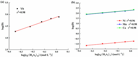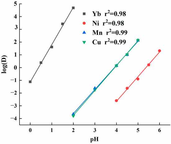 To further understand the impact of solution acidity on the extraction efficiency of elements, data processing was conducted on the distribution ratio of each element. The log(D) values were plotted as the dependent variable (y-axis) and pH values as the independent variable (x-axis), yielding linear equations for each element’s log(D) as a function of pH. As shown in Figure 3, the slope of the linear equation for ytterbium’s log(D) versus pH was 2.93, which was significantly higher than the slopes for other elements. The linear equations for calcium and manganese were similar, with their log(D) values falling within the same range. The slope of the linear equation for manganese was 1.91, slightly lower than the slope of 1.93 for calcium. Nickel had a slope of 1.95, but its log(D) value was lower overall than that of the other elements.