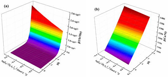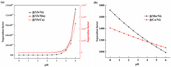 The corresponding K values were calculated based on the experimental data for the distribution ratio of each element, and Equations (9) and (10) were used to obtain Figure 4a,b. As shown in Figure 4a, the separation coefficients of ytterbium and other elements all increased with the rise in pH, with their growth rates following a similar trend, as the equations for the distribution ratios exhibited comparable slopes. The value of β(Yb/Ni) was higher than that of β(Yb/Mn) and β(Yb/Ca), which can be attributed to the relatively lower distribution of nickel at the same pH value. Figure 4b shows the variation trends of the separation coefficients β(Mn/Ni) and β(Ca/Ni) with acidity. It can be observed that the separation coefficients ranged from 987 to 1715, displaying a slow decreasing trend. The reduction rate of β(Mn/Ni) was faster than that of β(Ca/Ni), which was due to the differences in the slopes of their respective equations.
