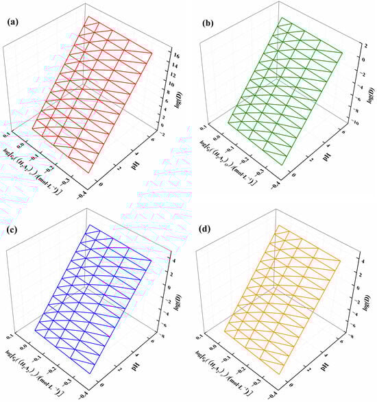 Using Formulas (15) and (16), the distribution ratios of ytterbium, nickel, manganese, and calcium were derived with respect to the changing solution acidity and extractant concentration, as shown in Figure 6. Figure 6a illustrates that the log(D) of ytterbium increased with both increasing pH and extractant concentration, with acidity having a greater influence on the ytterbium partition ratio, consistent with the slope results. Figure 6b–d show the relationships between the log(D) of nickel, manganese, and calcium and the acidity of the solution and extractant concentration, displaying a trend similar to that of ytterbium. However, the log(D) interval for ytterbium ranged from 2 to 16, while for nickel it ranged from −10 to 2, and for manganese and calcium, it ranged from −8 to 4. This indicates that solution acidity and extractant concentration can be controlled to achieve the separation of different elements.