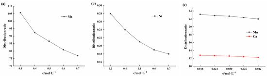 To further understand the influence of factors other than acidity and extractant concentration on the distribution data, experiments were conducted to examine the effect of different element concentrations in the solution on the distribution ratio. Ytterbium was tested at pH 2, while nickel, manganese, and calcium were tested at pH 5. The results of the influence of changes in ytterbium concentration are shown in Figure 8a. As the ytterbium concentration increased in the range of 0.3 to 0.7 mol/L, the distribution ratio gradually decreased. Figure 8b illustrates the effect of nickel concentration changes on the distribution ratio. As nickel concentration increased within the range of 0.3 to 0.7 mol/L, the distribution ratio also decreased, showing a trend similar to that of ytterbium. Figure 8c shows the influence of changes in manganese and calcium ion concentrations on the partition ratio. When the concentration of manganese and calcium ions increased from 0.018 to 0.042 mol/L, the partition ratio exhibited a slow decrease. In summary, as the initial element concentration increases, the element partition ratio gradually decreases. This can be attributed to the fact that an increase in element concentration in the solution inhibits the chemical reaction process. Additionally, the extractant’s saturation capacity limit and the reduction in the concentration of free extractant ions in the organic phase have significant effects.