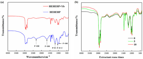 (a) Comparison of FT-IR spectra of pure HEHEHP extractant and extractant after extracting ytterbium. (b) Comparison of infrared spectra of different repeated usage times of HEHEHP Extractant.
