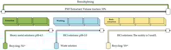 The process was tested with the following conditions: a solution pH of 4.5, a washing solution pH of 2, a 50% volume fraction of extractant, concentrations of 0.3 mol/L for Yb and Ni, and 0.02 mol/L for Mn and Ca, with three extraction and washing stages each. In addition, 5 mol/L hydrochloric acid, equal to the volume of organic, was used for stage 4 back-extraction to ensure that ytterbium was recovered to the water phase as much as possible. The process diagram is shown in Figure 11.