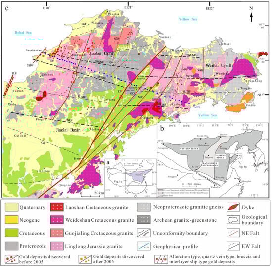 Figure 1. Geological and gold deposit distribution map of the Jiaodong region (modified from Song et al., 2024; Yang et al., 2024) [1,13]. (a)–Geotectonic Map of China; (b)–North China Craton; (c)–Geological and gold deposit distribution map of the Jiaodong region; EW-trending basement faults (black dashed lines); first-order faults: SXTRF: Sanshandao–Xiadian–Taocun–Rongcheng Fault, PXRF: Pingdu–Xuefang–Rushan Fault; Second-order faults: TLGTF: Tushan–Laiyang–Guocheng–Tengjia Fault, CJF: Cuijiaji–Jimo Fault, NE-trending strike-slip and extensional faults (red lines): First-order faults: TLF: Tancheng–Lujiang Fault, TJF: Taocun–Jimo Fault; Second-order faults: SSDF: Sanshandao Fault, JJF: Jiaojia Fault, ZPF: Zhaoyuan–Pingdu Fault, QXF: Qixia Fault, GCF: Guocheng Fault, MJF: Muping–Jimo Fault, QHF: Qingdao–Haiyang Fault, MRF: Muping–Rushan Fault, WHF: Weihai Fault. MTP1: Broadband MT sounding profile.