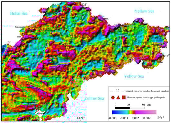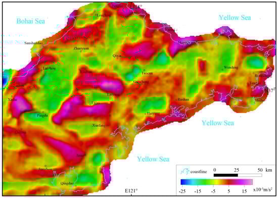 Previous studies have shown that basement structures can be inferred using gravity anomalies [19]. The Bouguer gravity anomaly exhibits a distinct EW-trending zonation in the Jiaodong region, characterized by five EW-oriented linear or bead-like high-value anomaly belts, where the value of Bouguer gravity anomalies is greater than 0 × 10−5 m/s2 (Figure 2).