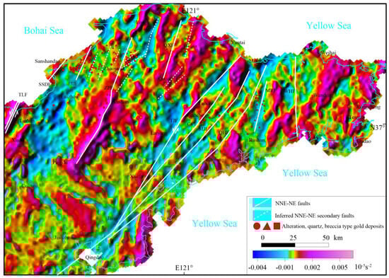 Figure 7. Vertical first derivative of the reduced-to-the-pole aeromagnetic ΔT anomalies in the Jiaodong region.