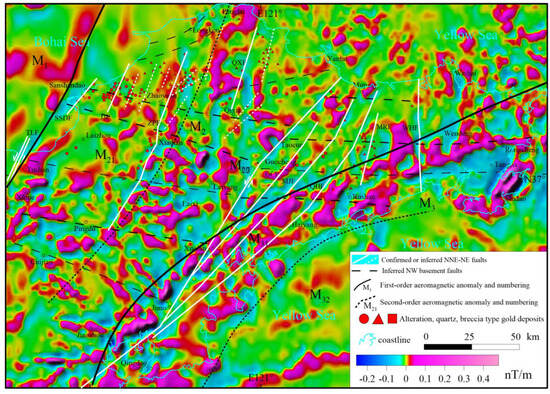 From north to south, these belts are the Sanshandao–Zhaoyuan–Qixia–Muping Belt, Sanshandao–Xiadian–Taocun–Rongcheng Belt, Tushan–Laiyang–Guocheng–Tengjia Belt, Pingdu–Xuefang–Rushan Belt, and Cuijiaji–Jimo Belt. Even after removing the influence of deep mantle material through residual anomaly extraction (Figure 2), the EW-trending anomaly belts remain prominent, reflecting the Cambrian basement structures and rock formation characteristics of the Jiaodong region. During the Triassic period, the collision between the Yangtze and North China Plates led to the northward subduction and compression of the Yangtze Plate. This tectonic event significantly altered the morphology of the Paleoproterozoic crystalline basement, forming EW-trending folds or anticlinal structures, with lithologies dominated by Paleoproterozoic sedimentary crystalline basement. By applying first-order vertical derivative calculation, the geophysical characteristics were significantly enhanced, leading to the identification of five EW-trending basement structural belts (Figure 3). These belts fundamentally control the spatial distribution of gold deposits in the Jiaodong region. Gold deposits in the Jiaodong region are primarily distributed north of two first-order fault zones: the Sanshandao–Zhaoyuan–Qixia–Muping Fault (abbreviated as SZQMF) and the Pingdu–Xuefang–Rushan Fault (abbreviated as PXRF). These deposits exhibit a typical EW-trending distribution pattern.
