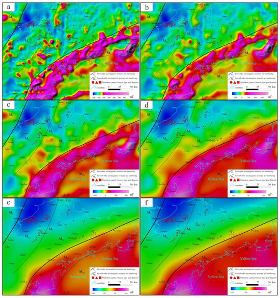 Figure 8. Aeromagnetic anomalies at varying upward continuation heights in the Jiaodong region. (a) Upward continuation to 0.5 km. (b) Upward continuation to 2 km. (c) Upward continuation to 5 km. (d) Upward continuation to 10 km. (e) Upward continuation to 20 km. (f) Upward continuation to 30 km.
