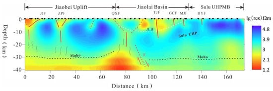 Figure 9. MT sounding inversion cross-section along the Sanshandao–Rushan (MTP1) profile in the Jiaodong region. HYF: Haiyang Fault; JLB: Jiaolai Basin; Moho: Moho discontinuity Black wavy lines: magma or fluid migration pathways.