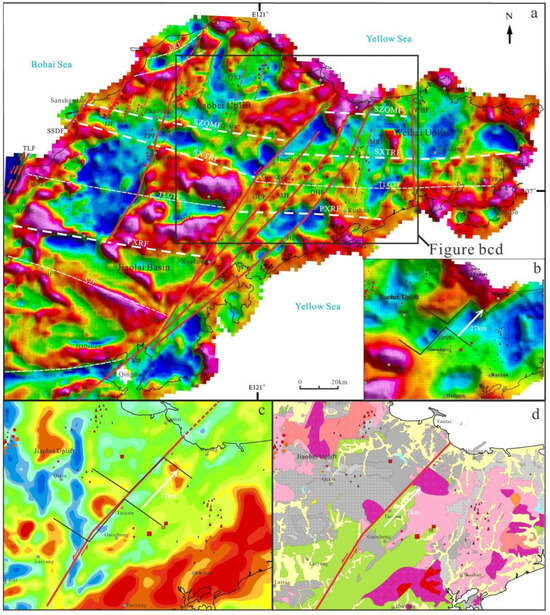 By calculating the vertical first derivative of the Bouguer gravity anomaly, distinct differences in gravity anomalies were observed across the TJF (Figure 10a). The western block exhibits integrated gravity anomalies with higher amplitudes, while the eastern region shows scattered, low-amplitude anomalies. The TJF displays strong continuity, extending northward to the offshore area south of Yantai and connecting southward to the Wulian Fault near Jimo. In contrast, the GCF, MJF, and QHF are located within zones of minimal gravity amplitude variation. These three faults share comparable anomaly amplitudes, gentle lateral gradients, and poor continuity. Upward continuation analysis (Figure 5) reveals no deep-seated signatures for these faults, indicating that their shallow crustal origins as Mesozoic extensional faults formed during the retreat of the Paleo-Pacific Plate.