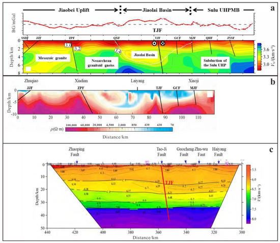 Pan et al. (2015) [34] conducted active-source deep seismic wide-angle reflection/refraction profiling in the Jiaodong Peninsula (Figure 11c). Their findings revealed that the Zhuwu Fault (referred to as the MJF in this study) and GCF exhibit significant undulations in velocity contours across the G interface, while their structural variations above the C1 interface are relatively uniform. These faults penetrate the basement but terminate above the C1 interface, consistent with results from natural seismicity and MT surveys. The crustal velocity structure on both sides of the TJF exhibits lateral and vertical heterogeneity from shallow to deep levels: The G interface shows significant variation, deepening eastward. From the surface to the Moho (M interface), the velocity structure differs markedly between the eastern (lower velocities) and western (higher velocities) sides, reflecting distinct block characteristics. Near the fault zone, the C1, C2, and M interfaces display localized uplift or depression, while the C3 interface is only present in the western segment. These observations suggest that the TJF is a deep-crustal fault and represents the deep-seated manifestation of the collisional boundary between North China and the Yangtze Block [34].