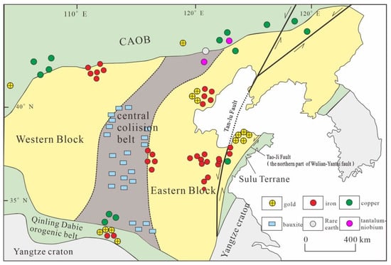 Figure 12. Distribution of major metallic mineral deposits in the North China Craton and its periphery (after Zhu et al., 2015) [35].
