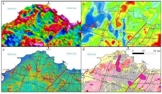 Figure 13. Gold metallogenic prospect areas in northwestern Jiaodong. (a) Vertical derivative map of Bouguer Gravity anomaly. (b) Reduced-to-pole aeromagnetic anomaly map. (c) Topographic map. (d) Geological sketch map.