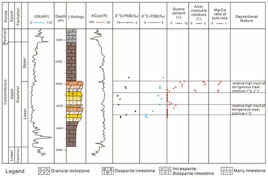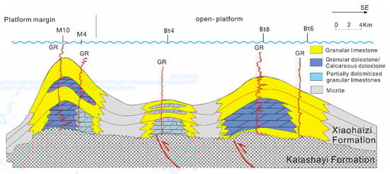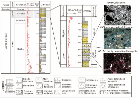 The upper and lower members developed in the Xiaohaizi Formation []. The main lithology of the Upper Member is marly limestones or argillaceous micrites, deposited in lagoon [,]. However, the Lower Member mainly contains granular limestones and dolostones, which formed on shoals of the open platform [] (Figure 2). The lithology of the Lower Member is characterized by porous granular dolostones alternating with tight cemented granular limestone. The grains include ooids, oncoids, bioclastic debris (e.g., algae, bivalve, brachiopod, echinoderm), intraclastic material and full organism (e.g., Fusulinella sp., Taizchoella sp., Climacammina sp., Cribrogenerina sp., and Globivalvulina sp.) [,].
