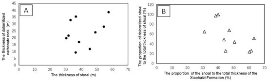 Correlation analysis of the dolomitized carbonate rocks and thickness of shoals and proportion of shoals to total thickness of Xiaohaizi Formation. (A) Crossplot of the thickness of shoal and the thickness of dolomitized carbonate rock. (B) Crossplot of the proportion of the shoal to the total thickness of the Xiaohaizi Formation and the thickness of dolomitized shoal to the total thickness of shoal.