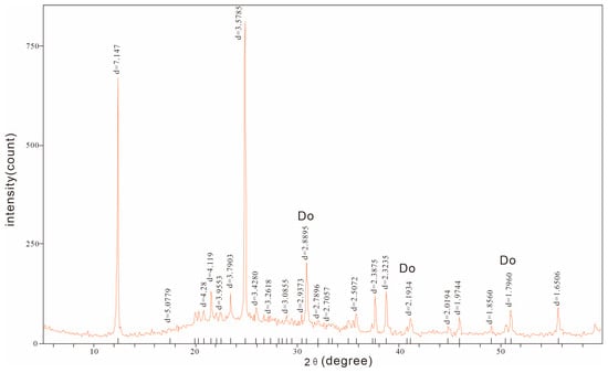 There are variable amounts of terrigenous material in carbonate rocks of the Xiaohaizi Formation. The detrital grains in granular dolostones are dominated by well-sorted and round quartz (Figure 3A), with minor kaolinite, dickite, illite, and uncertain terrigenous materials. The weight percentages of terrigenous material in granular dolostones range from 1.47 to 4.17 wt.% (Table 3). The size of terrigenous quartz ranges from 0.15 to 0.2 mm. Through the counting of terrigenous grains point by point under microscope, the contents of terrigenous detrital grains in granular dolostones in well M10 were determined to range from 1% to 8%. There are more terrigenous detrital grains in dolostones than in limestones (Figure 5). The contents of terrigenous grains increase upwards vertically in dolostones in the Lower Member of Xiaohaizi Formation on stratigraphy column of well M10 (Figure 5). The diffraction peak of illite (d = 4.28) can be seen on the XRD pattern (Figure 6).
