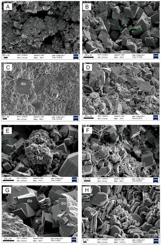 Textural morphology of minerals and grains in granular dolostones and partly dolomitized limestones. Identification of minerals was performed by energy spectrum: (A) Completely dolomitized grains, well BT2, 1923.6 m; (B) Euhedral dolomite with size of 10–30 μm, planar-e, granular dolostones, well BT2, 1923.6 m; (C) Dolomites with size of about 80 μm replaced the lime, partly dolomitized limestones, well BT2, 1928.7 m. (D) SEM image of quartz in dolostone, well M4, 4387.35 m. (E) Microcrystalline dolomites occur in the particle of terrigenous material, well BT2, 1923.6 m; (F) Illite-like clay minerals cover the surface of dolomites, well M4, 4386.85 m. (G) Kaolinite predated crystalline dolomite, well BT2, 1923.6 m; (H) Microcrystalline dolomites form on the surface of kaolinite, well M4, 4387.35 m. do—dolomite; Cc—calcite; TM—terrigenous material; Q—quartz; K—kaolinite.
