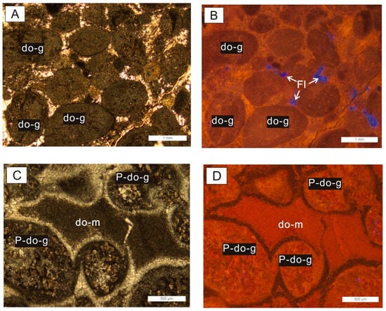 Type B dolomites partially replaced microcrystalline calcite within grains in dolostones, with cloudy center and clear rim (Figure 8C). In the SEM image, type B dolomites have coarse crystal (about 80 μm), larger than type A dolomites (Figure 7A–C). The coarse crystalline type B dolomites under CL have relatively brighter mottled red color than type A dolomites in granular dolostones (Figure 8B,D).