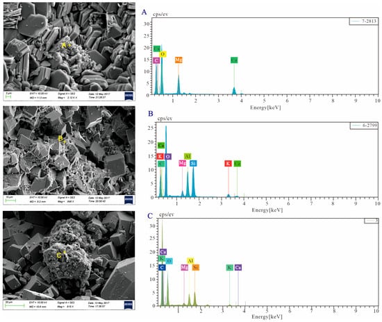 Minerals determined by Energy Disperse Spectroscopy. (A) Microcrystalline round dolomite on the surface of kaolinite; (B) Illite-like clay mineral on the surface of fine crystalline dolomite; (C) Several microcrystalline rhombic dolomites occur on a terrigenous grain. These images imply the precipitation of dolomite might be related to clay minerals.