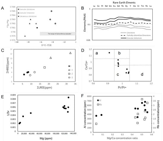 Cross-plot of geochemical parameters of Upper Carboniferous Xiaohaizi Formation in Bachu-Makit area. (A) Cross-plot of 87Sr/86Sr and δ18O (PDB) of dolostones and limestones. (B) PAAS-normalized REE patterns of samples from Xiaohaizi Formation. PAAS data is from McLennan, 1989. Dark full lines represent REE patterns of granular dolostone. Short dash lines represent REE patterns of partially dolomitized limestones, while dotted lines represent REE patterns of limestone. Positive La anomalies, slightly positive Gd and Y anomalies are displayed in these samples. (C) Comparison among dolostones and limestons shows granular dolostones of granular dolostones have the highest amount of ∑REE. I-1: Granular dolostone; I-2: Partially dolomitized limestone; I-3: Granular limestone; II: samples with Ba contamination. (D) Dots located in a,b,c areas indicate there is no Ce negative anomaly. The template is from Bau and Dulski (1996) []. (E) Strong positive correlation between 1/Sr and Mg, showing the Sr concentration is related to mineral facies. (F) Weak positive correlation between Mg/Ca concentration ratio between Al and Rb. Input of terrigenous sediments seems to increase Mg/Ca ratio.