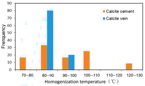The result of homogenization temperature of fluid inclusions within calcite veins or cements in granular dolostones was shown in Table 12. In terms of the homogenization temperature of saline fluid inclusions, the lowest formation temperature of calcite cements most frequently occurred at 80–90 °C, with minor at 100–110 °C and 120–130 °C (Figure 11). However, the calcite vein filled with fractures has the lowest formation temperature of 80–90 °C (Figure 11).