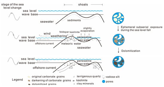 (2) The occurrence of vadose silt, detrital kaolinite, and fabric-retentive dissolution show that granular dolostones experienced subaerial exposure predating dolomitization. With the falling sea level, the subaerial exposure of shoal on the platform was accompanied by the enhanced input of terrigenous materials by river entrenchment and downcutting from the north of the study area.
