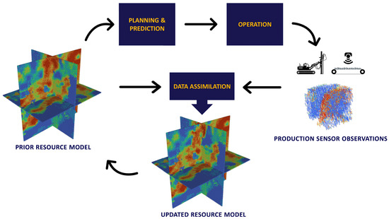 Real-time production data from various sensors can quickly update resource knowledge and inform short-term mine planning decisions. Incorporating these observations into geostatistical models can enhance the accuracy and precision of forecasts. Buxton and Benndorf [3] suggest that integrating sensor data could reduce uncertainty and deviations from production targets, potentially resulting in an average economic benefit of $5 million per year for the studied deposit. To effectively integrate sensor observations, tools such as the Kalman filter (KF) [4] and the ensemble Kalman filter (EnKF) [5] are recommended for the rapid updating of resource and grade control models [6,7]. In addition, Benndorf and Buxton [8] introduced a real-time mining concept that transforms discontinuous process monitoring into a near-continuous framework through data assimilation (see Figure 1). In this closed-loop framework, short-term planning decisions can take from minutes for dispatching to up to an hour for block classification tasks [9].