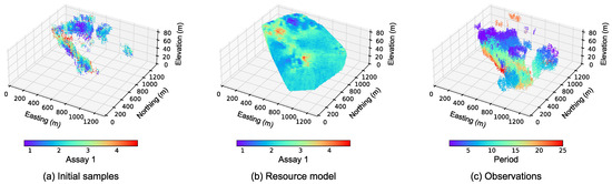 3D view of initial samples of Assay 1, a prior resource model with average simulated values of Assay 1 and observations divided into 25 periods.