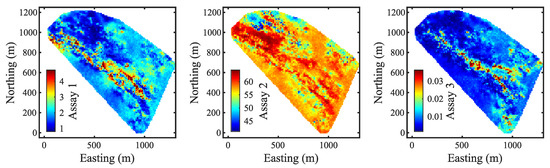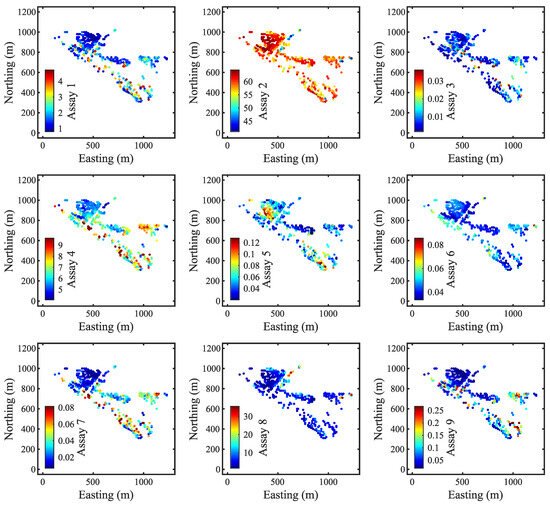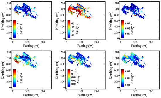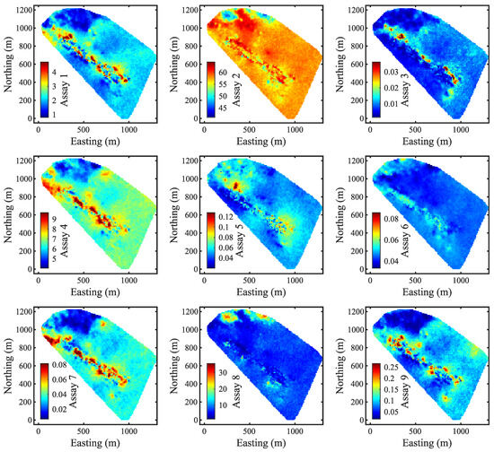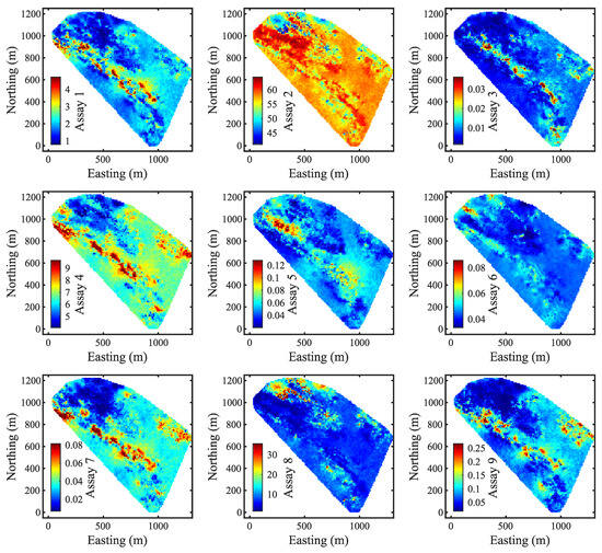 The resource model consists of 100 realizations with blocks of size 10 m × 10 m × 4 m. Figure 3 provides a 2D view of the e-type models for each assay variable at an elevation of 44 m. As the observations were tracked back to their corresponding blocks, the spacing between the data points aligned with the dimensions of the blocks.