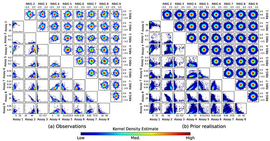 Cross-plots of original and transformed variables are shown in Figure 4. The multivariate relationships in this dataset are complex, with non-linearities in some bivariate distributions. There is also a noticeable skewness in some variables, particularly Assay 3. The cross-plots of both prior realization and observations are visually similar in terms of kernel density and ranges. Ultimately, RBIG successfully generated multi-Gaussian factors that satisfy the Gaussian assumption of EnKF-MDA.