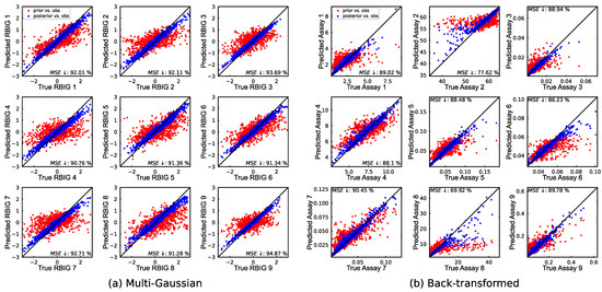 Predictions versus observations plots indicate that the updated multi-Gaussian results closely align with the diagonal line (Figure 5). After back-transformation, all variables, except for Assay 2 and Assay 8, maintained an error reduction close to 90%. The lower error reductions for these two variables can be attributed to the combination of different factors. As shown in Table 1 and Figure 5, these two have larger values compared to other variables, are skewed, and were predicted less accurately in the prior model. Although Assay 1 also has relatively larger values than others, its distribution is not skewed. On the other hand, despite it being significantly more skewed, Assay 3 has an excellent error reduction of 89% due to a much closer prior prediction. The long tails of the predicted values for Assay 2 and Assay 8 contain numerous highly inaccurate predictions, ultimately impacting the final updated results. Notably, removing Assay 2 and Assay 8 does not significantly affect other variables, with only a 1.24% average difference compared to the results in Figure 5.