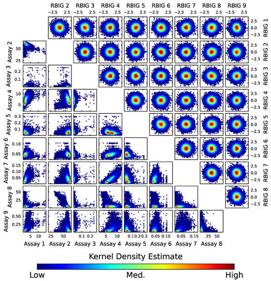 Cross-plots of assay variables and corresponding RBIG factors for observations in period 1 and a prior realization of the neighborhood around the observations.