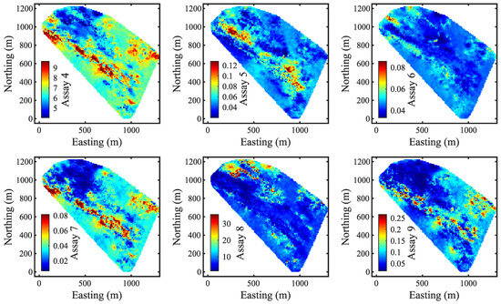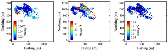 Figure 9 illustrates four more sets of observations from periods 6 to 9. The first thing to notice here is that the area between 600–800 m northing and 1100–1300 m easting, which was unexpectedly updated in Figure 8, aligns closely with actual observations at those locations. This indicates that nearby data can contribute to refining the model predictions. However, the biggest discrepancies between new observations and previous models are found in the lower sections of the maps. Updated models after period 9 now provide a more accurate representation of that lower part of the map (Figure 10). Furthermore, previously underestimated high-grade zones have also become more distinct for variables such as Assay 4 and Assay 7.