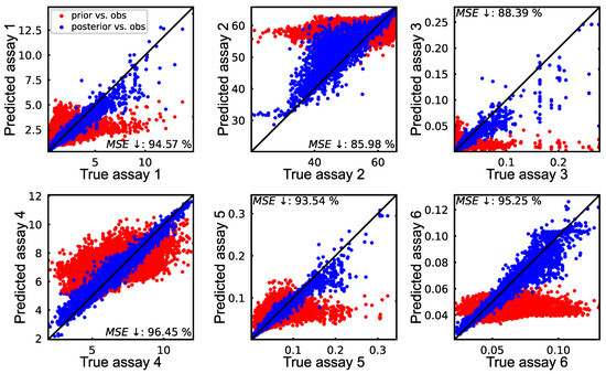 A standard EnKF helps reduce MSE by 61%–77% across nine assay variables. With five data assimilations, the error reduction improves to 84%–91%, which provides a good balance between accuracy and computation time. Finally, after ten data assimilations, all nine variables achieved an MSE reduction of over 90%. Each data assimilation, which involved 100 realizations with 15,561 blocks and 868 observations, took 1.7 s to complete. This means that ten data assimilations took just 153 s in total. Given the relatively fast computation speed, we have set the number of data assimilations in this case to ten. Additionally, the covariance localization radius was chosen to be 30 m.