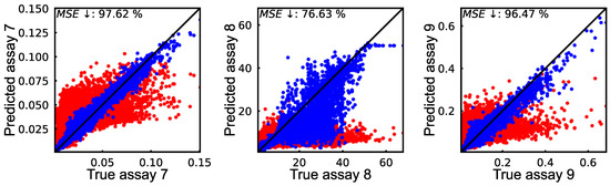 A more detailed analysis of the final updated models is presented in Figure 13, where predictions are plotted against the observed values. The updated results closely align with the diagonal line, and most variables achieve an error reduction between 86% and 9%. However, Assay 8 only reduced its MSE by 76.73%, which is significantly lower compared to the other variables. This discrepancy is particularly evident in the plot, with many points positioned far from the diagonal line.