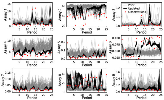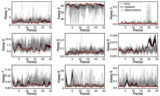 All the previous figures primarily analyze the average results from all realizations. To focus on how rapid updating affects individual realizations, we calculated the errors between the updated results and the observations. In each period, we selected a block with an error close to the median of all the errors. We chose the median because it ensures that 50% of the blocks exhibit better predictions while the other 50% show worse predictions. Figure 14 displays the prior and updated realizations for the blocks that have errors near the median in each period. The updated results closely match the observations for each variable. Furthermore, rapid updating has minimized uncertainty, as demonstrated by the reduced spread of realizations before and after the updates. However, uncertainty is slightly higher for larger values due to the skewness of the distributions. This is particularly evident in Assay 6, where values in later periods are significantly higher and have a broader spread of realizations. Interestingly, Assay 8, despite showing relatively low error reduction, shows very accurate results in this figure.