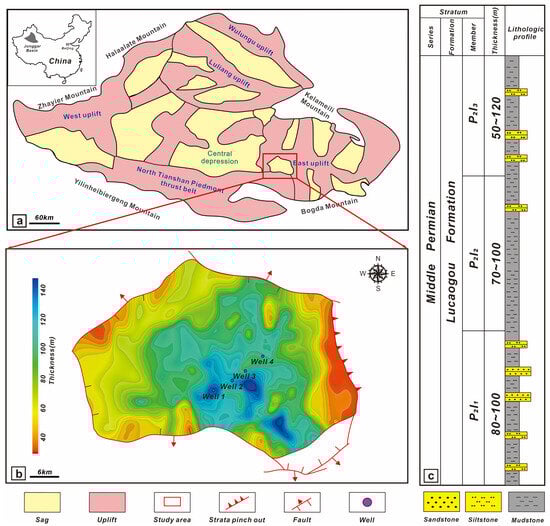 (a) Location of Jimusaer, (b) stratigraphic thickness map of the Permian Lucaogou Formation Section 1, and (c) stratigraphic succession of the Permian Lucaogou Formation.