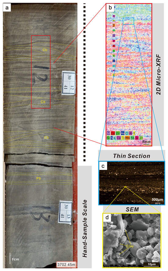 Lithofacies LS2 macro–micro scale comparison. (a) Core photograph showing small-scale cross-bedding (Cb) and small-scale parallel bedding (Pb), (b) high-resolution microarea scan with enriched elemental laminations, (c) cast thin section (cross-polarized light) showing irregular interlayers of silt and clay, and (d) clay mineral filling and developed intercrystalline pores.