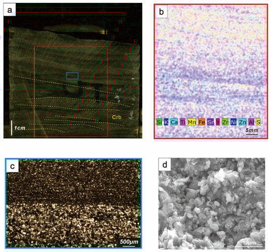 Lithofacies LS5 macro–micro scale comparison. (a) Core photograph showing irregular laminations and calcite vein filling, (b) high-resolution microarea scan, (c) cast thin section (cross-polarized light) showing laminated structure, and (d) scanning electron microscope image.