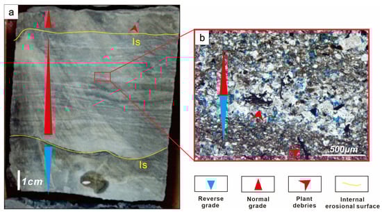 Lithofacies LS5 sedimentological features. (a) Core photograph of silty mudstone showing intraformational erosion surfaces and graded bedding at 3684.35 m, Is-Internal erosional surface, and (b) cast thin section showing graded bedding with irregular plant debris.