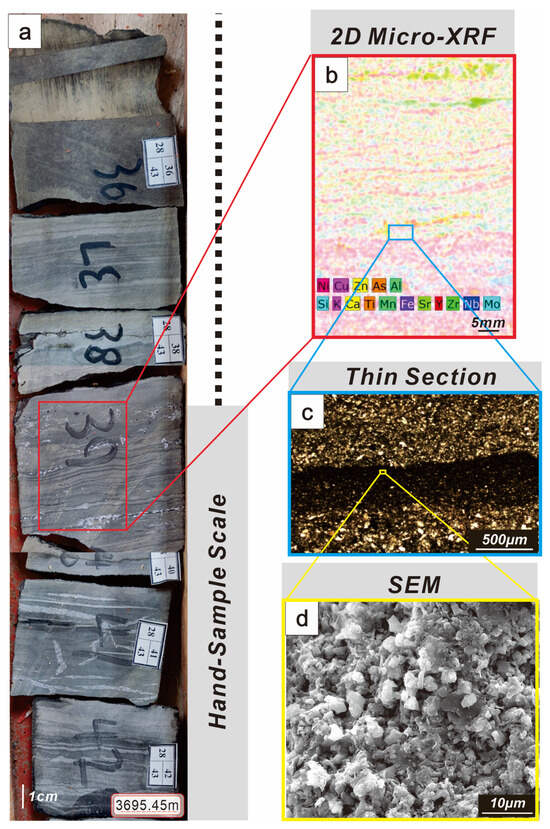 To facilitate a comprehensive and accurate analysis of lithofacies types, reservoir characteristics, and resource potential of the Lucaogou Formation, detailed core observations and descriptions were conducted prior to sample collection. Core sample photographs were primarily obtained from Well W2 in Section 1 of the Lucaogou Formation, located at the center of the lake at depths ranging from 3670.73 to 3716.98 m (Figure 1b). Thirty core samples were selected for high-performance microarea scanning, based on their representativeness in showcasing typical sedimentary features. The overall lithology of these samples comprises mud shale and siltstone to fine sandstone, characterized by continuous deposition and good preservation. All samples underwent routine core analysis (porosity, permeability), optical microscope examination, and electron microscope identification. The thin section and SEM samples were selected for their representative mineral contacts, millimeter-scale porosity, typical laminated features, and common mineral compositions, such as clay minerals, quartz, and carbonate.