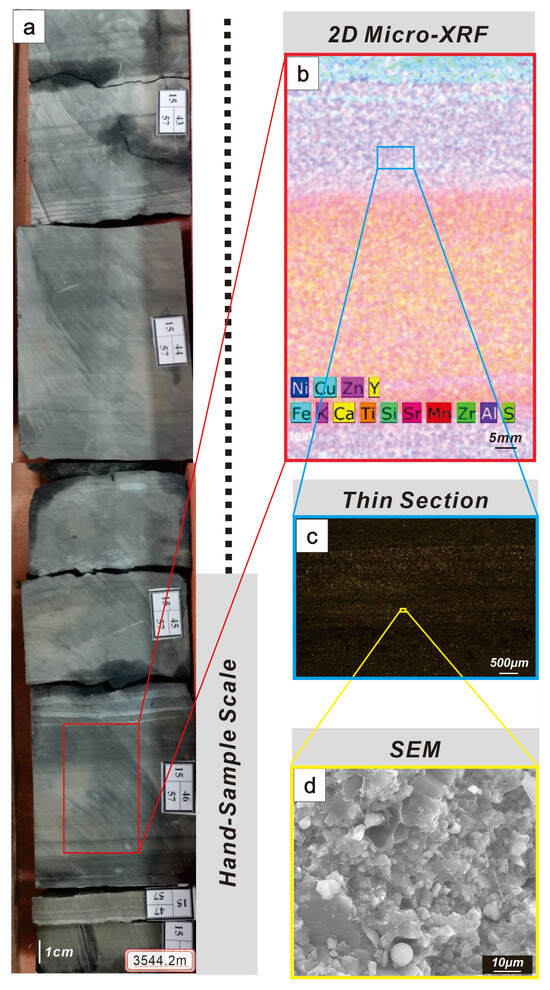 Lithofacies LM2 macro–micro scale comparison. (a) Core photograph showing horizontal laminations, (b) high-resolution microarea scan showing layered structure, (c) cast thin section (cross-polarized light) showing laminated structure, and (d) scanning electron microscope image.