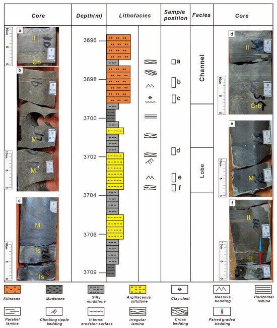 The lobe facies were subdivided into lobe and lobe-margin subfacies. The primary lithologies comprise very fine sandstone and silty mudstone, characterized by graded bedding, climbing ripple lamination, and irregular lamination. The subfacies sequence is most completely developed in Well W2 of the Lucaogou Formation between 3702.0 and 3703.4 m. The base of the assemblage features irregular lamination, followed by graded bedding (Figure 9f), a middle layer of massive bedding (10–20 cm thick) (Figure 9e), and is capped by climbing ripple lamination combined with irregular lamination (Figure 9d). This sedimentary structure, formed during fluctuations in flood hyperpycnal flow energy, predominantly comprises suspended load deposits and is interpreted as hyperpycnal flow lobe deposits. These deposits correspond to relatively weak hydrodynamic conditions, finer lithologies, and relatively thin individual layer thicknesses (1.4 m).