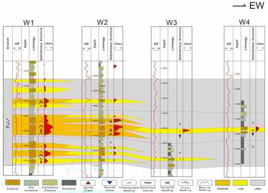 In the southern Jimusaer Depression, Wells W1, W2, W3, and W4 were selected sequentially from southwest to northeast to establish a continuous well profile of Section 1 of the Lucaogou Formation, corresponding to the direction of provenance progression. Stratigraphic comparisons among these four core wells were performed by integrating core sediment subfacies identification, nuclear magnetic porosity (35 ms) log interpretation, and log curve similarity analysis. This approach yielded insights into the reservoir’s lateral geometry, thickness, and physical property variations. The analysis focused primarily on the lithofacies of Well W2, with comparative assessments from the other three wells.